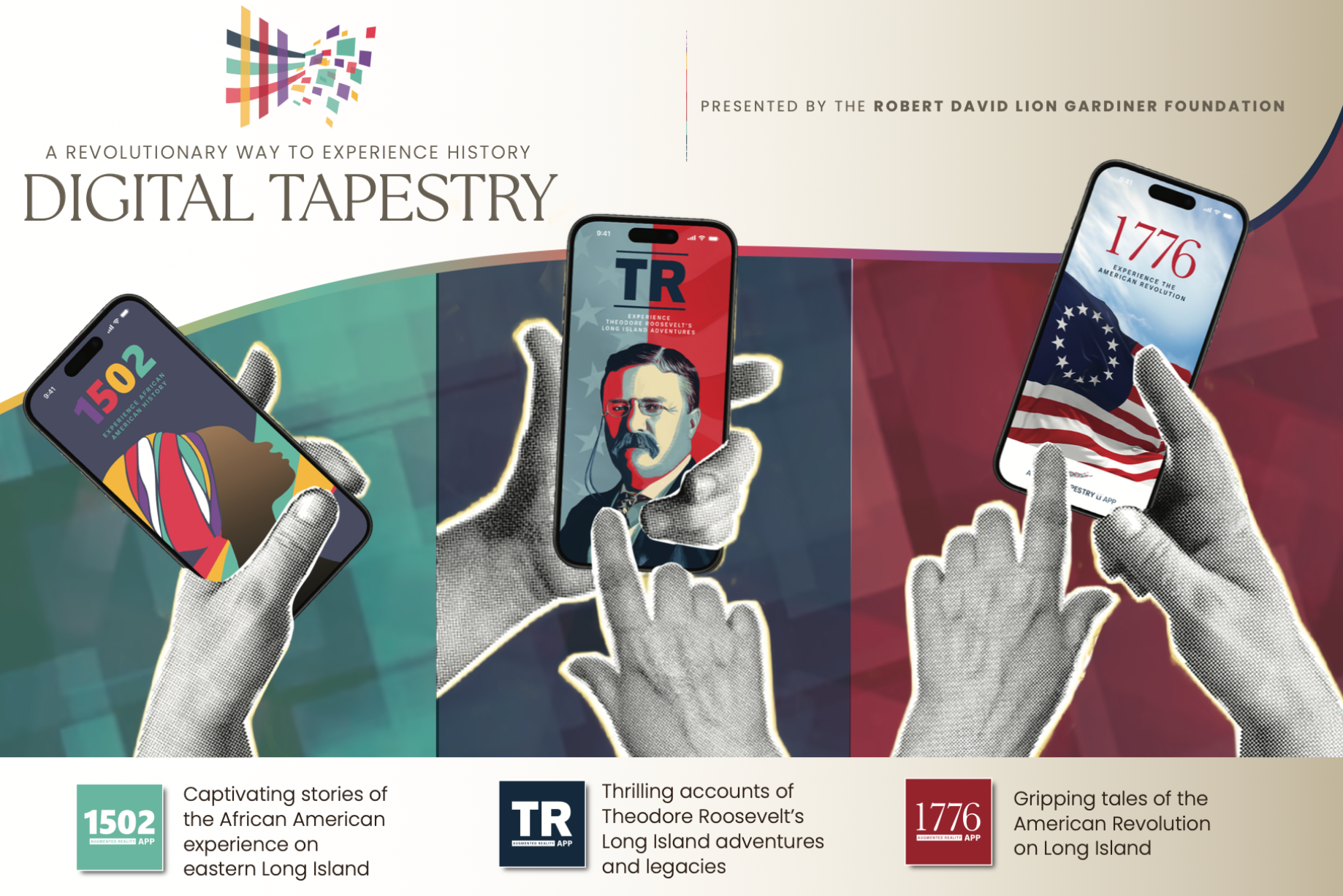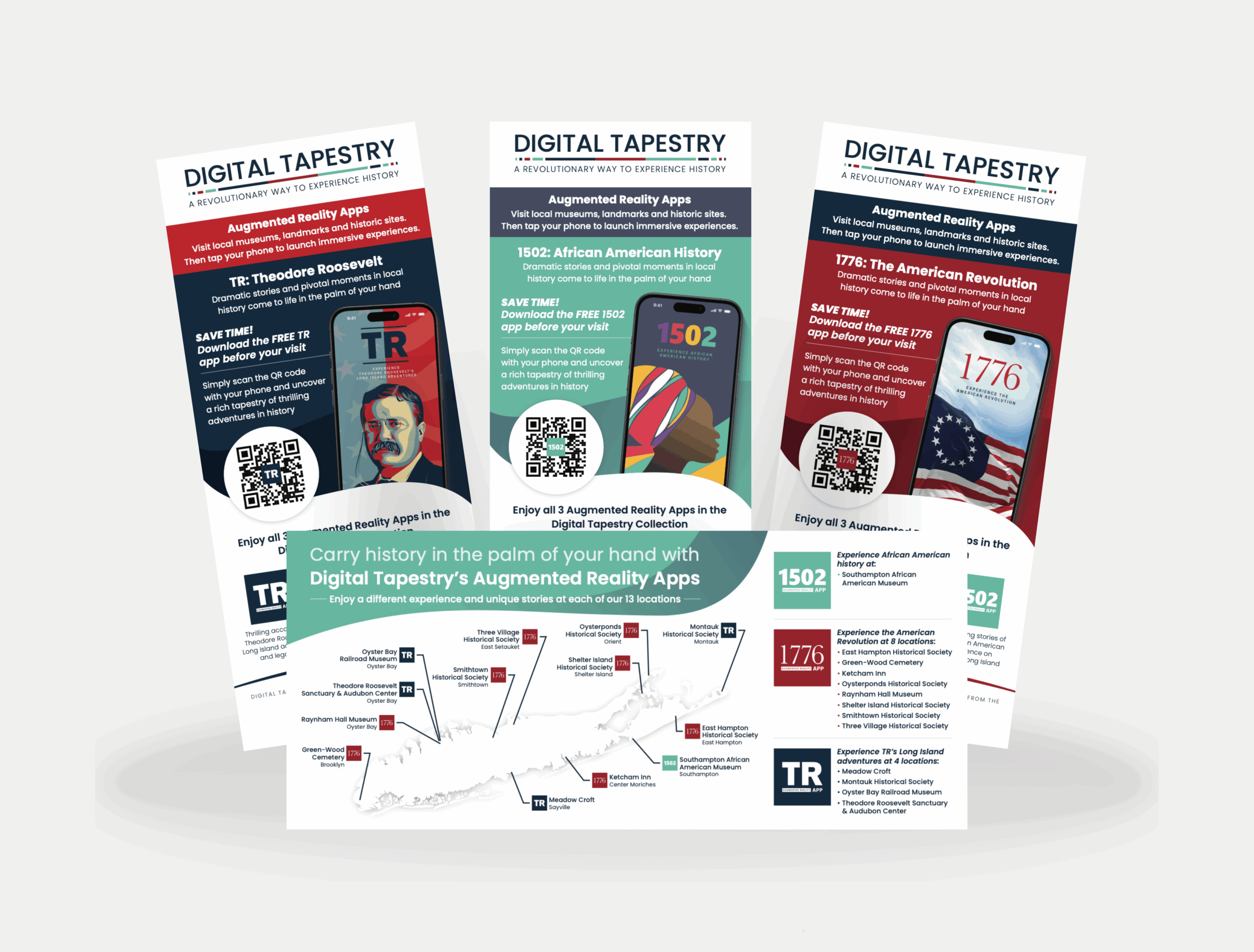 From sharing the captivating stories of the African American experience on the east end of Long Island to the thrilling accounts of Theodore Roosevelt and gripping tales of the American Revolution on Long Island, Digital Tapestry’s Augmented Reality apps are a a game changer in the museum experience. KGI worked to enhance the brand of each experience, which allows local museum visitors to carry history in the palms of their hands, and provide marketing materials to educate visitors about the apps and how they work.Just in time for America250 you too can visit the local museums and enjoy a different way to learn about history.